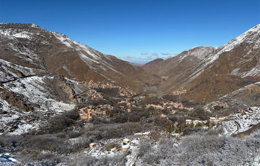 Réunion de travail à l’hôtel, journée dans la vallée du Haut Atlas (Imlil) avec randonnée guidée, rencontre avec les habitants et déjeuner traditionnel sur le toit d’une kasbah.